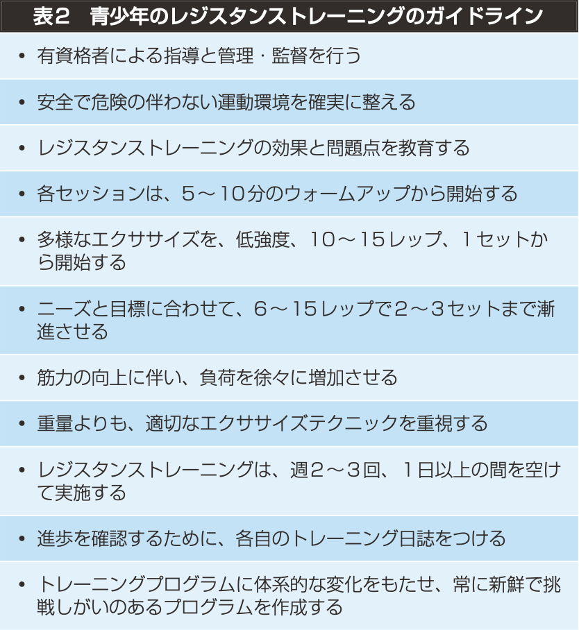 適切な指導とプログラムがあれば、レジスタンストレーニングは強力なコンディショニング方法となります(表2)。子どものトレーニングは、週に2~3回、1日以上の間隔を空けて行うことが推奨されます。最初は低強度で、徐々に負荷を増やしていくことが重要です。重要なのは、重量よりも適切なエクササイズテクニックを重視することです。
