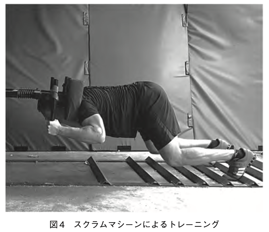 そしてプレシーズン後半は、フィールド上でのコンディショニングだけでなく、水平面を中心としたレジスタンストレーニングなど、スクラムやラグビーに特異的なレジスタンストレーニング実施に最適な段階になります。水平面の動作を強化するためには、スレッドプッシュやスレッドプル、スクラムマシーントレーニングの導入が推奨されています。