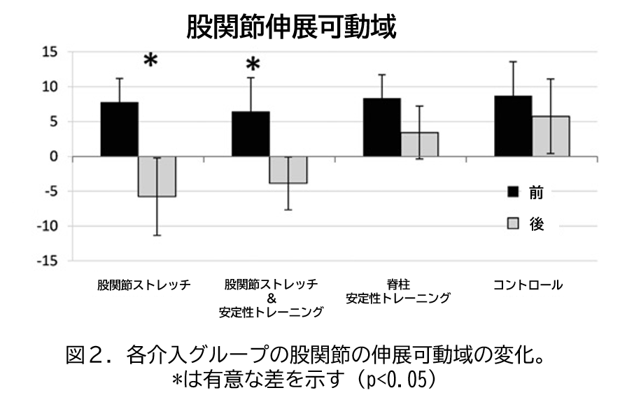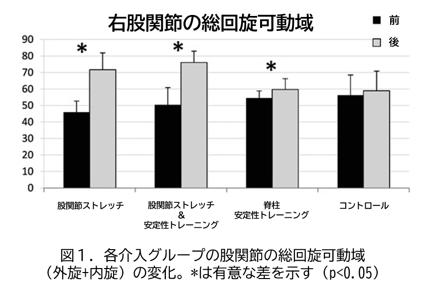 コントロール群では介入前後の有意差はありませんでしたが、ストレッチをせずコアエクササイズのみを行ったグループでも介入前後で有意な差が見られました。変化率はわずかでしたが、股関節の回旋可動域は右側で9.7%、左側で13.2%向上しました(p<0.05)。